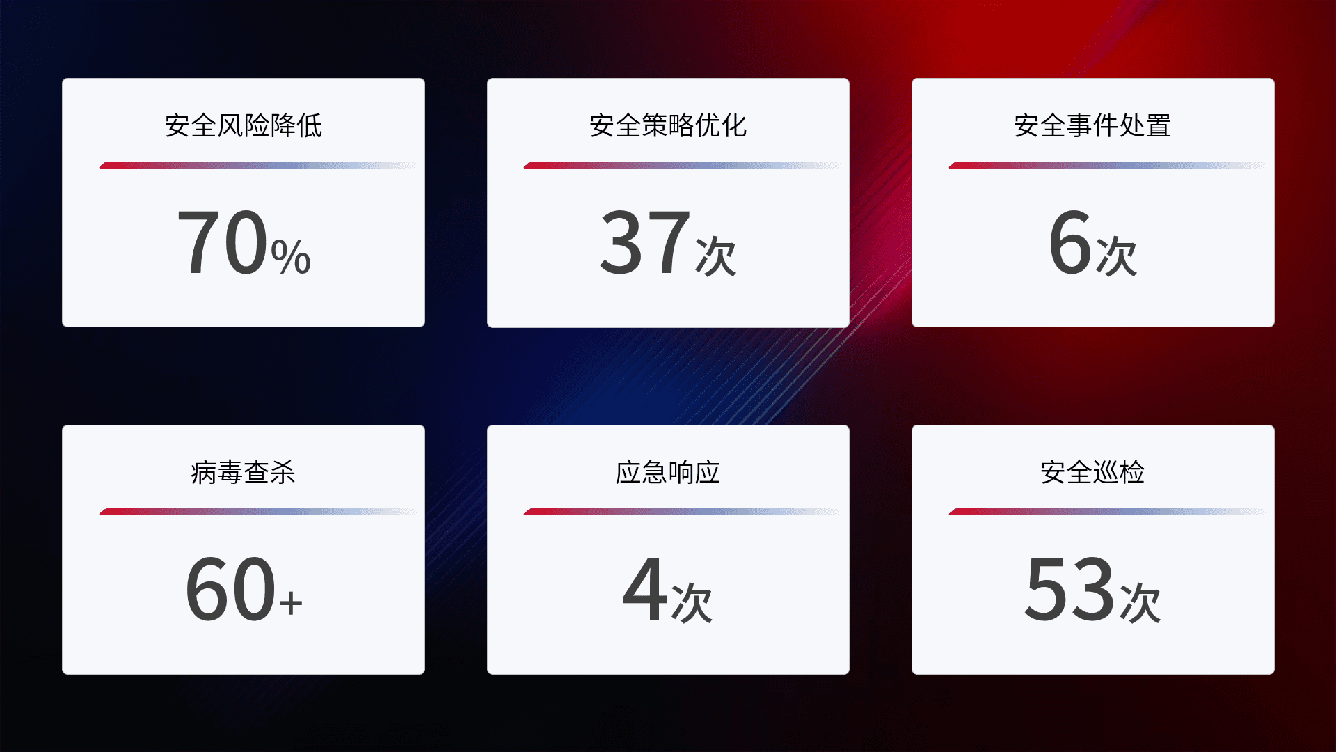 提供全面的安全事件报告体系,,包括处置报告、、、周报、、、、季度和年度总结,,,,结合持续监控,,,帮助客户深入了解网络安全状况。。